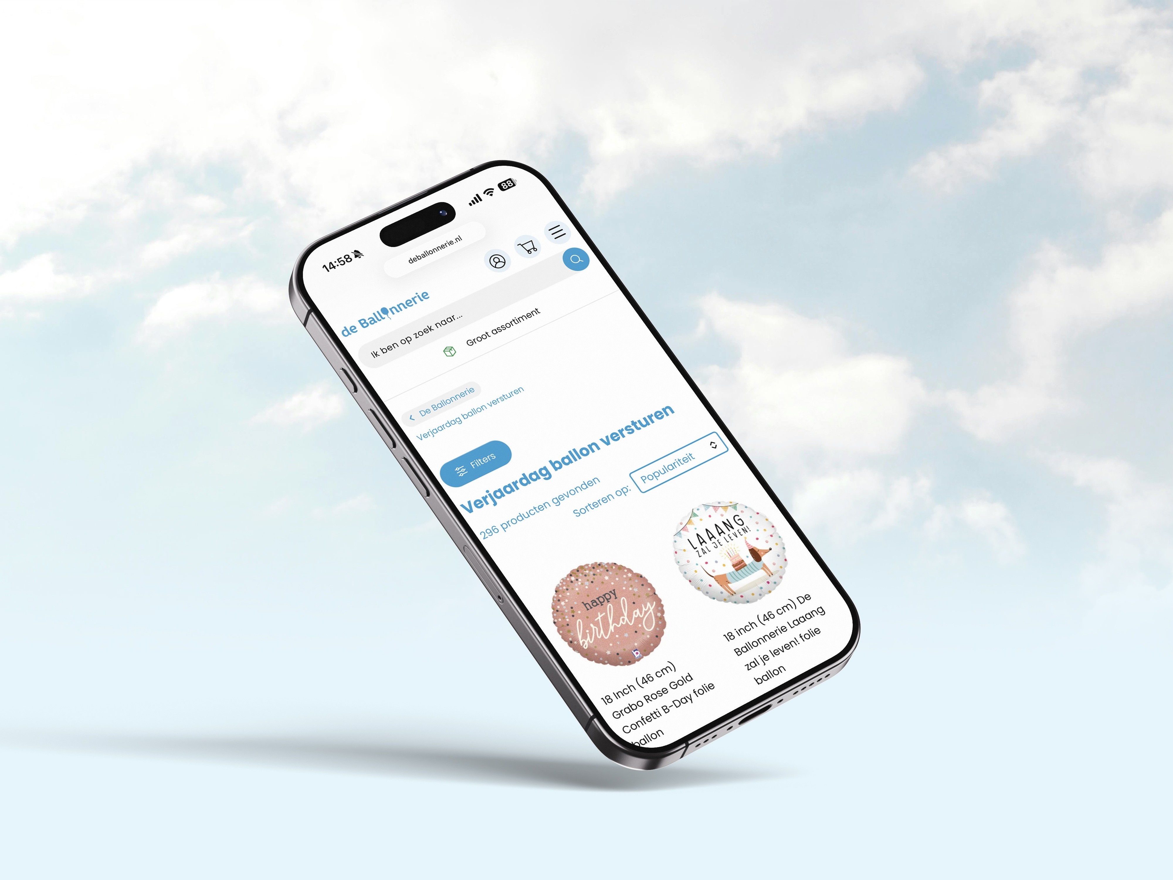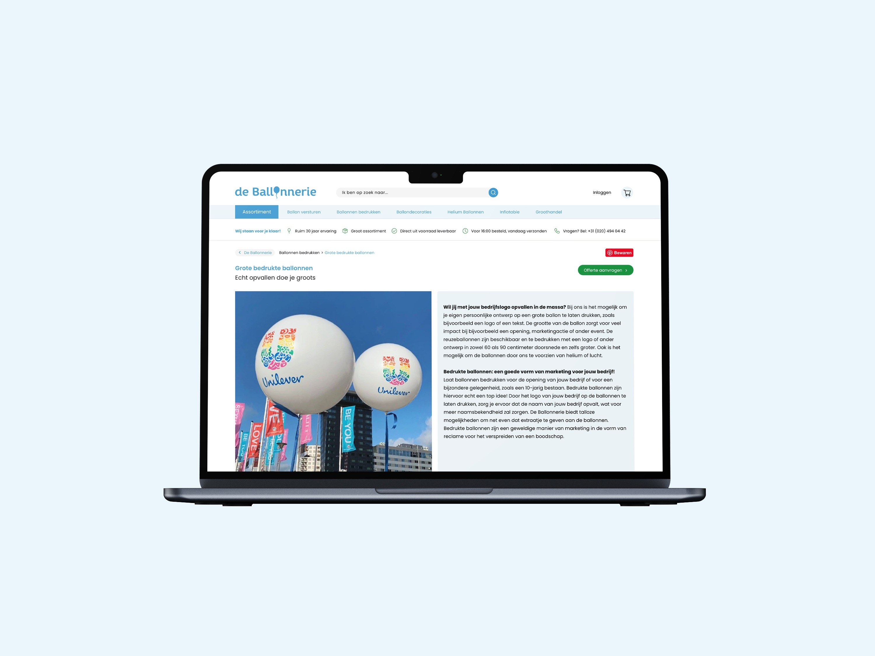 Omdat de oude huisstijl en webshop niet meer aan de wensen en eisen van de huidige tijd voldeden, vroeg De Ballonnerie ons enerzijds om een restyling van de huisstijl en anderzijds om een nieuwe webshop met betere techniek. Zodat ze hun klanten optimaal zouden kunnen bedienen en zodat processen voor medewerkers zouden verbeteren.